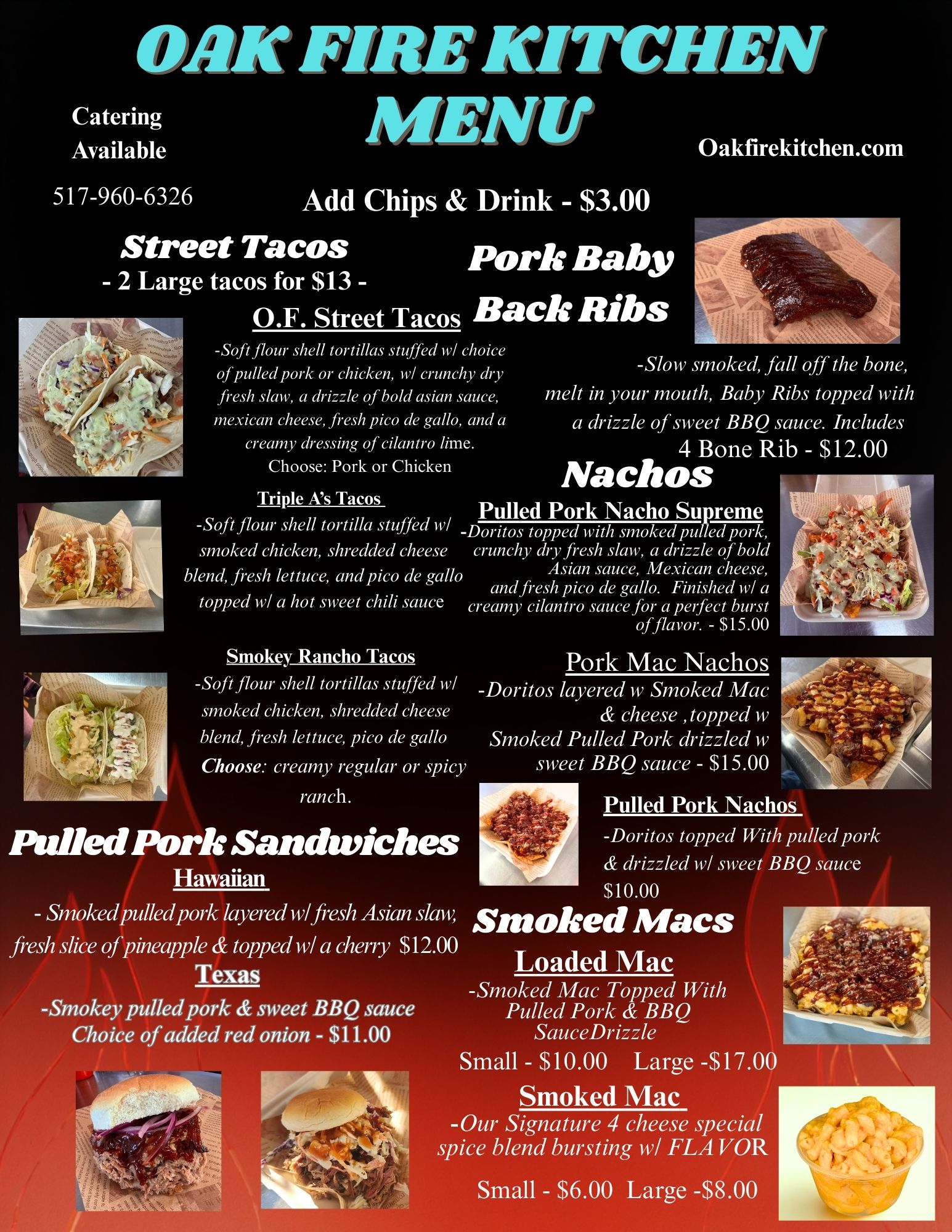 Satisfy your cravings with the bold, smoky flavors of Oak Fire Kitchen! Perfect for events, gatherings, or just a delicious meal on the go